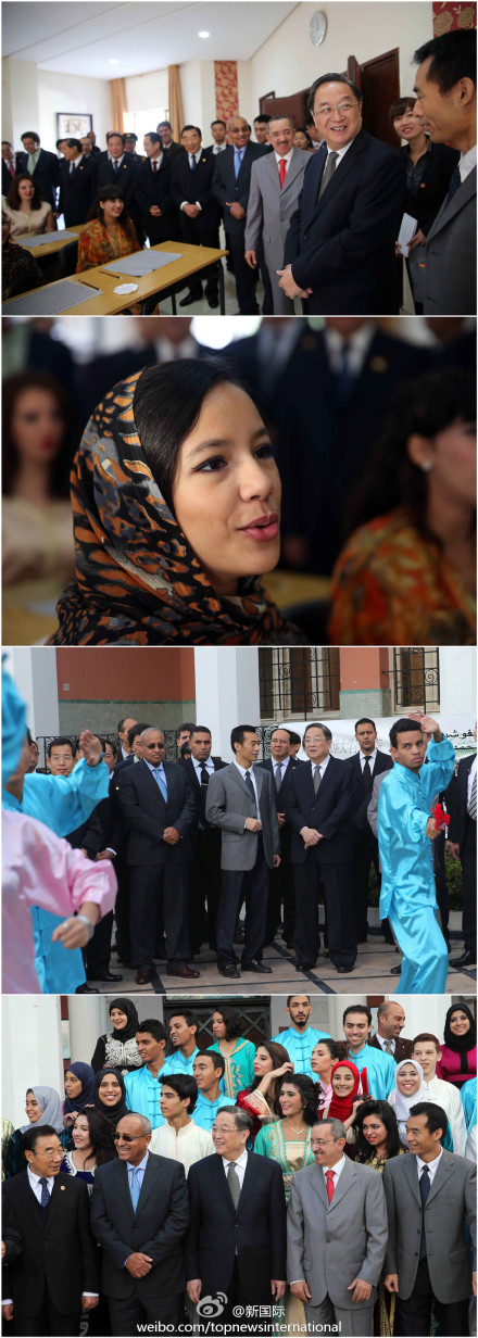 ??? 新華網(wǎng)北京11月6日電 據(jù)新華社“新國(guó)際”微博報(bào)道,全國(guó)政協(xié)主席俞正聲5日參觀摩洛哥穆罕默德五世大學(xué)孔子學(xué)院,身著摩中兩國(guó)民族服裝的當(dāng)?shù)貙W(xué)生誦唐詩(shī)、打太極、跳《小蘋果》歡迎。俞正聲走進(jìn)課堂對(duì)學(xué)生說:“你們是中摩友好的未來。希望大家用心學(xué)好中文,促進(jìn)合作交流。” (記者李拯宇 攝影劉衛(wèi)兵)