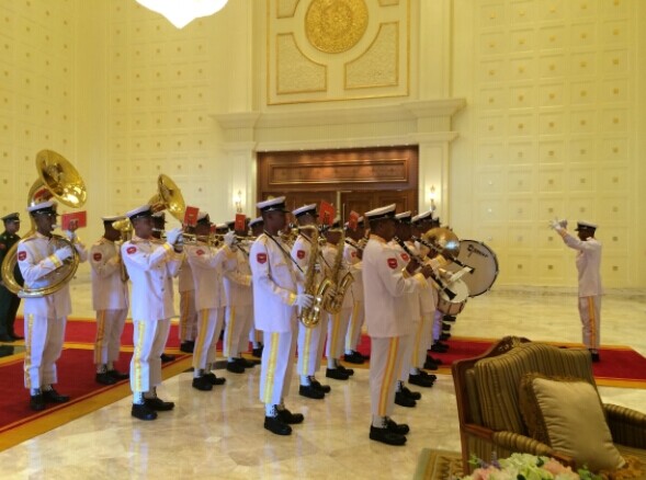 11月14日,緬方軍樂隊在為李克強總理舉行的歡迎午宴上奏響兩國國歌。