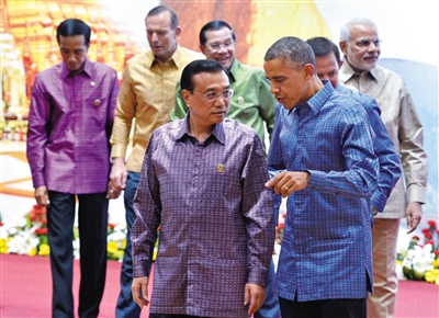 11月12日,李克強與奧巴馬在東亞峰會期間交談。