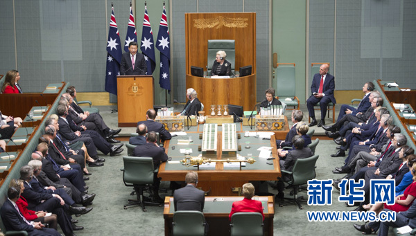 ??? 11月17日,國家主席習近平在澳大利亞聯邦議會發表題為《攜手追尋中澳發展夢想 并肩實現地區繁榮穩定》的重要演講。 新華社記者 謝環馳 攝