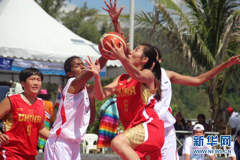 ??? 11月16日,中國沙灘籃球運動員房玲玲(左三)與安靜(左一)在比賽中。中國體育代表團16日在泰國普吉舉行的第四屆亞洲沙灘運動會上勇奪2枚金牌和2枚銅牌。當天比賽全部結束時,中國隊以3金2銀5銅的成績暫列獎牌榜第五。新華社發(塔納攝)