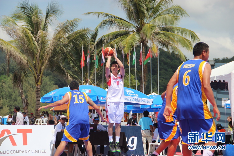 ??? 11月16日,中國沙灘籃球運動員劉洺宇(中)在比賽中。中國體育代表團16日在泰國普吉舉行的第四屆亞洲沙灘運動會上勇奪2枚金牌和2枚銅牌。當天比賽全部結束時,中國隊以3金2銀5銅的成績暫列獎牌榜第五。新華社發(塔納攝)