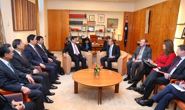 當主席車隊抵達議會大廈“總理庭院”時,阿博特總理已在辦公室門口等待。兩位領導人已是老熟人了,握手、合影、在貴賓簿上簽名……那里早已擠滿了各路記者。大家都知道,這可是難得的拍攝機會,幾分鐘后,領導人就要閉門會談了?!?/p>