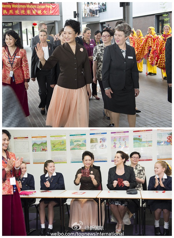 ??? 新華網(wǎng)北京11月19日電 據(jù)新華社“新國(guó)際”微博報(bào)道,習(xí)近平主席夫人彭麗媛19日在悉尼參觀育文武女子學(xué)校,在舞龍隊(duì)引導(dǎo)下來到孔子課堂。“白日依山盡……”16名女孩朗誦《登鸛雀樓》,還學(xué)打中國(guó)結(jié)、制作剪紙、繡織漢字“中澳友誼長(zhǎng)存”。彭麗媛拿起剪刀,剪出一個(gè)“福”字。?