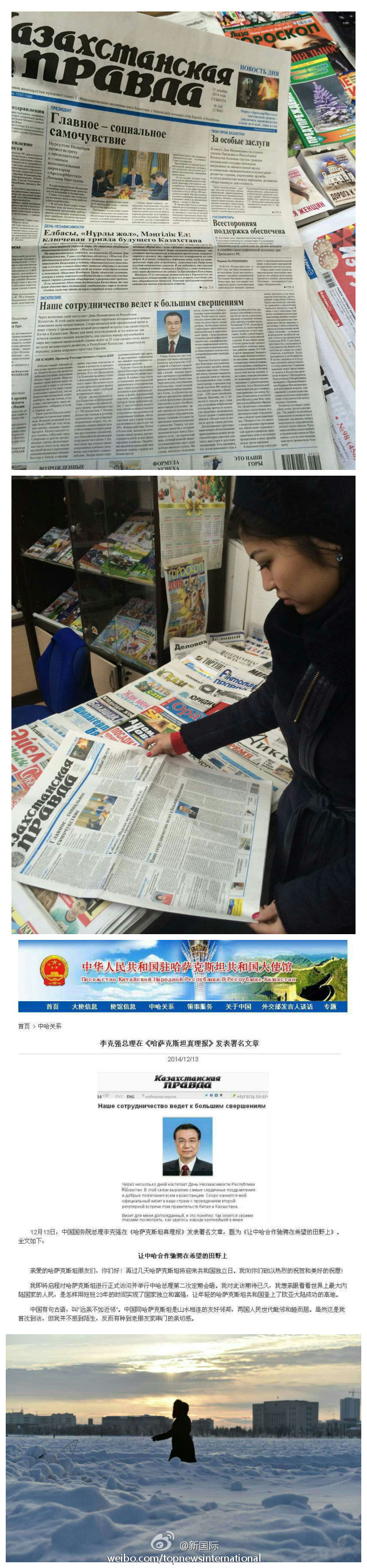 ????新華網北京12月13日電? 據新華社“新國際”微博報道,哈薩克斯坦真理報13日頭版刊登李克強總理訪前發表的署名文章《讓中哈合作馳騁在希望的田野上》??偫肀硎荆泄怯押绵彴?,歷史淵源深厚,戰略互信不斷加深,利益融合愈加緊密,他對中哈合作未來充滿信心。李克強還就即將到來的哈薩克斯坦獨立日向當地民眾致以祝賀和祝愿。