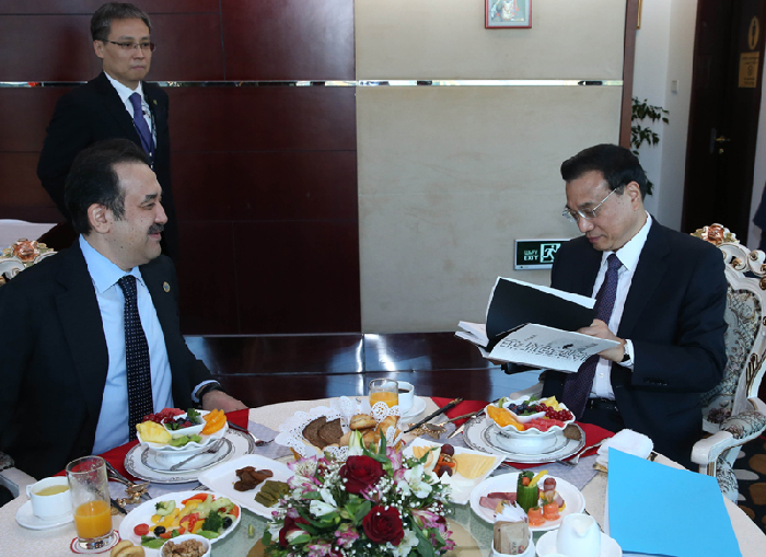 李克強與哈薩克斯坦總理馬西莫夫共進早餐。新華社 龐興雷 攝