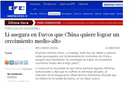 22日,西班牙埃菲社報(bào)道了李克強(qiáng)總理在達(dá)沃斯世界經(jīng)濟(jì)論壇上的致辭,特別提到他就中國經(jīng)濟(jì)增速放緩的回應(yīng)。報(bào)道中引用李克強(qiáng)總理的話:“中國經(jīng)濟(jì)進(jìn)入新常態(tài),經(jīng)濟(jì)由高速增長轉(zhuǎn)為中高速增長。發(fā)展則必須由中低端水平邁向中高端水平,為此要堅(jiān)定不移地推動(dòng)結(jié)構(gòu)性改革。”
