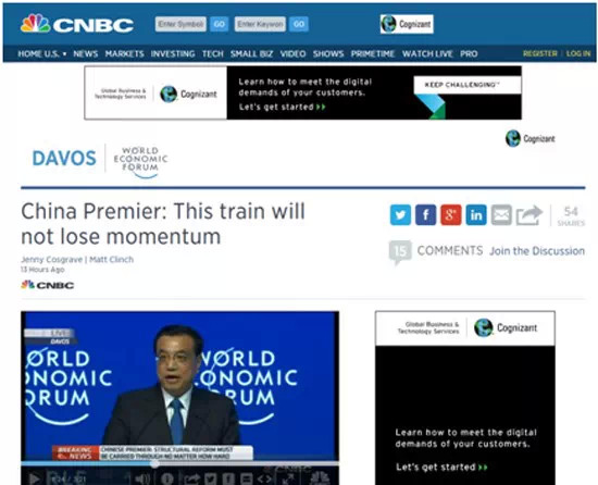 華爾街日報(bào)、彭博新聞社、金融時(shí)報(bào)、CNBC和美聯(lián)通訊社等美國主流媒體,都報(bào)道了李克強(qiáng)總理在達(dá)沃斯論壇上有關(guān)中國將避免經(jīng)濟(jì)硬著陸,以及確保在中長期經(jīng)濟(jì)有所增長的講話。