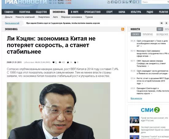俄新社以一篇題為《中國經(jīng)濟(jì)不會(huì)失速,而會(huì)更加穩(wěn)定》的文章,報(bào)道了中國經(jīng)濟(jì)的發(fā)展前景。文中稱,2014年中國經(jīng)濟(jì)發(fā)展速度是7.4%,這是1990年以來的一個(gè)低點(diǎn),但中國經(jīng)濟(jì)的發(fā)展正在體現(xiàn)“新常態(tài)”,即體現(xiàn)在質(zhì)的提升。