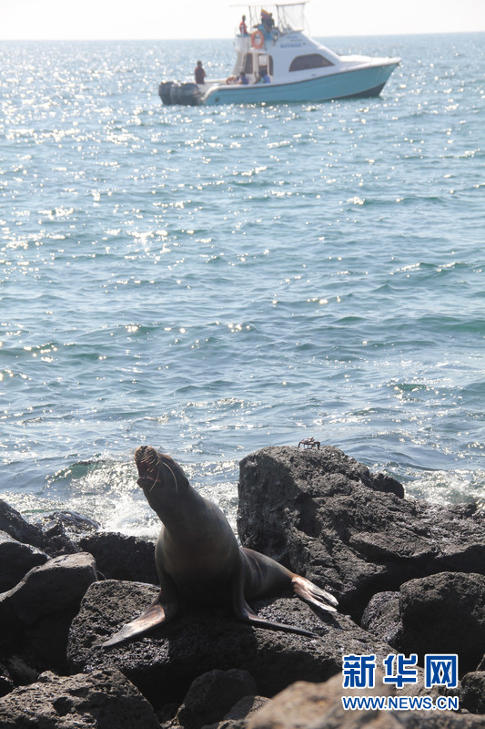 一只海獅在圣克里斯托巴(San Cristobal)島海邊的礁石上發出低叫,不遠處有輪船駛過。