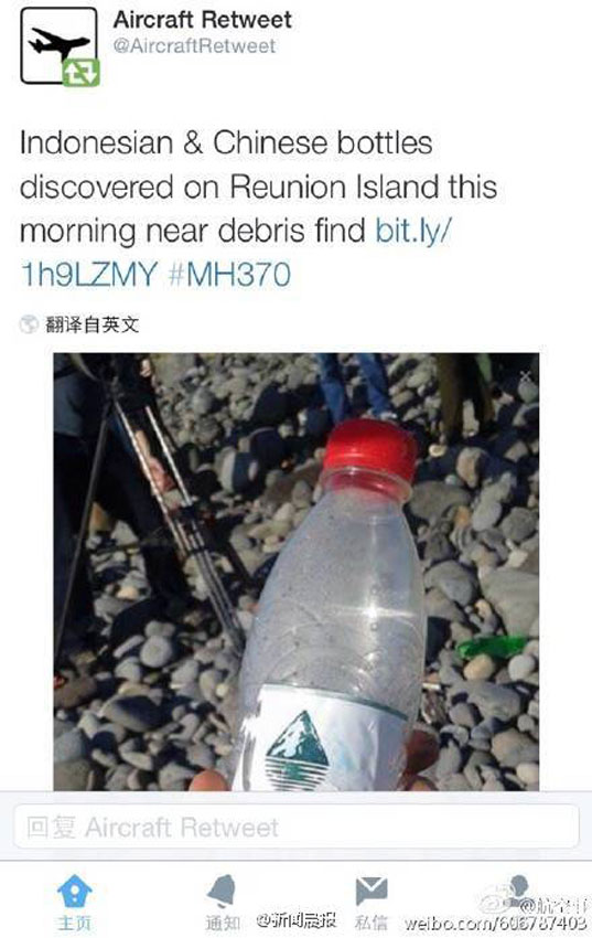 疑似MH370殘骸地發現中國礦泉水瓶(組圖)