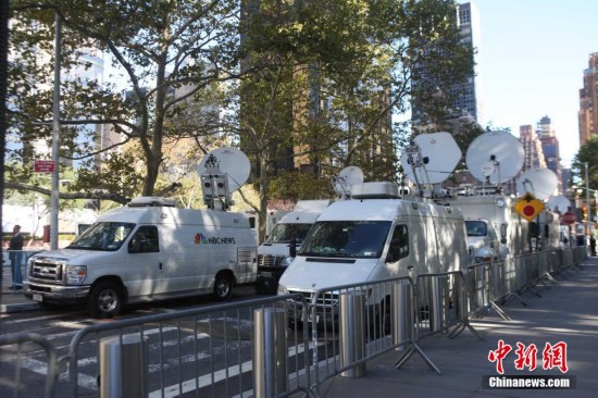 當地時間9月24日,電視媒體轉播車在紐約聯合國總部外云集。聯合國發展峰會將于25日至27日舉行,150余位世界各國領導人將出席本次峰會。 中新社記者 鄧敏 攝