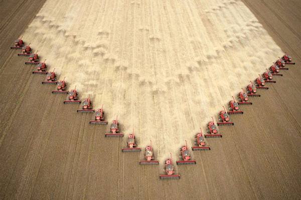↑2009年3月5日,在巴西西部的馬托格羅索州,工人們駕駛收割機在田間收割大豆。(新華社/路透)