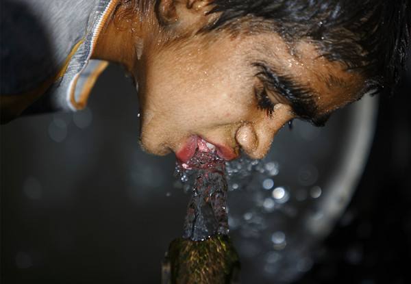 ↑2013年9月14日,在尼泊爾多爾克哈地區,一名12歲的男孩在喝水。(新華社/路透)