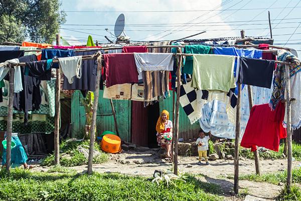 ↑2013年10月13日,在埃塞俄比亞首都亞的斯亞貝巴一處貧民窟內,一名婦女坐在自家門口的晾衣桿前。(新華社記者李京攝)