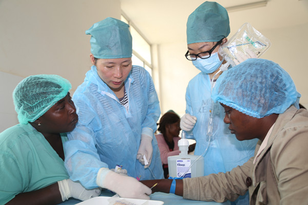 2014年12月10日,解放軍援塞醫(yī)療隊為中塞友好醫(yī)院由留觀中心轉(zhuǎn)型為留觀診療中心開展輸液培訓(xùn)活動。這是中方隊員在教授塞方護理人員留置針的穿刺方法。 新華社發(fā)(戴欣 攝)