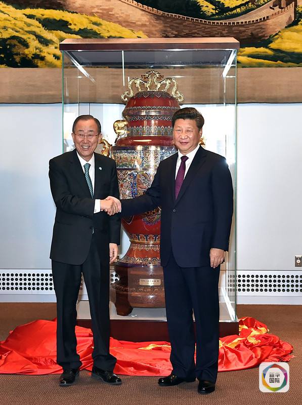 習(xí)近平出席中國(guó)向聯(lián)合國(guó)贈(zèng)送“和平尊”儀式。新華社記者李濤攝
