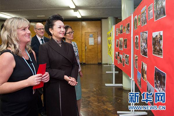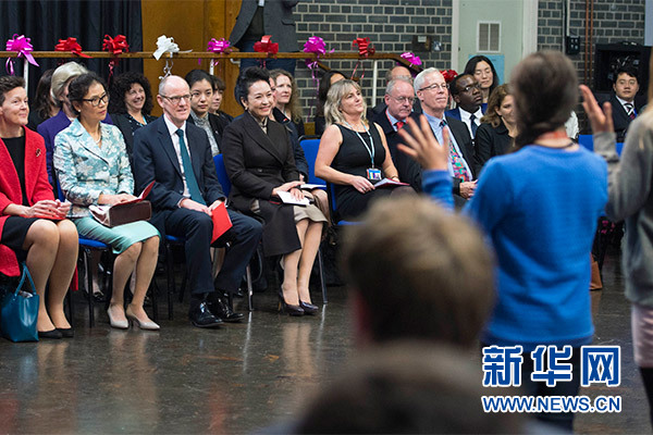 在英國教育部國務大臣吉布、學校校長等陪同下,彭麗媛觀看學生們用中文進行的才藝表演,參觀學校成果展,觀摩中文課,與女學生們互動交流,并向學校贈送中國文化及漢語學習類圖書及音像制品。