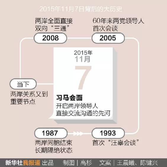 2015年11月7日,兩岸領導人習近平、馬英九將在新加坡會面,就推進兩岸關系和平發展交換意見。這是兩岸關系發展史上具有里程碑意義的大事。(來源:新華社客戶端? 文字:陳鍵興、王晨曦)