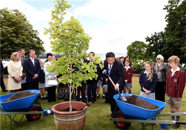 圖為2014年11月18日,習近平在澳大利亞塔斯馬尼亞州與小學生共同植樹。(饒愛民攝)