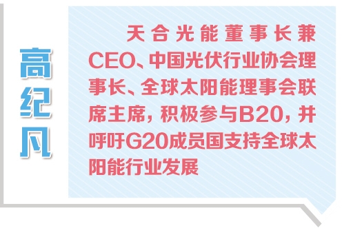 出席B20的全球太陽能理事會聯席主席、天合光能董事長兼CEO高紀凡在接受《經濟日報》記者采訪時表示,太陽能發電已成為全球最便宜的電力資源之一,建議二十國集團(G20)支持全球太陽能理事會“至2030年在太陽能行業創造1000萬個就業機會”的目標,建立太陽能領域的國家級、公私合作的數據收集和傳播網絡。