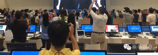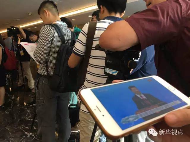 由于峰會(huì)現(xiàn)場(chǎng)場(chǎng)地有限,許多記者無(wú)法到會(huì)場(chǎng)實(shí)地進(jìn)行采訪報(bào)道。不愿錯(cuò)過(guò)精彩瞬間的他們架起“長(zhǎng)槍短炮”,對(duì)準(zhǔn)新聞中心內(nèi)正在直播開幕式實(shí)況的大屏幕。