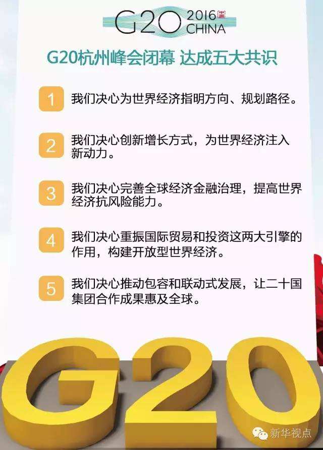 從4日下午,習近平主席敲下木槌,宣布峰會開幕,至5日下午峰會閉幕。一天半的時間,領(lǐng)導人在峰會上圍繞會議主題和重點議題進行了熱烈而富有成果的討論,就加強政策協(xié)調(diào)、創(chuàng)新增長方式,全球經(jīng)濟金融治理,國際貿(mào)易和投資,包容和聯(lián)動式發(fā)展等議題,以及影響世界經(jīng)濟的其他突出問題,深入交換看法,達成許多重要共識。