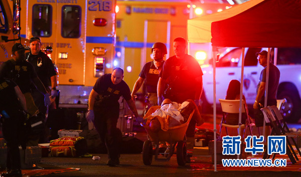 10月1日,在美國西部城市拉斯維加斯,工作人員在槍擊事件現場救治傷者。新華社/美聯