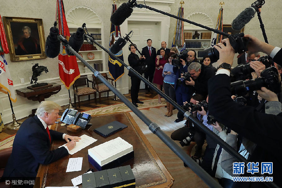 當(dāng)?shù)貢r(shí)間22日,美國(guó)華盛頓,美國(guó)總統(tǒng)特朗普在白宮的橢圓形辦公室簽署1.5萬(wàn)億美元稅改法案,此乃美國(guó)最近逾30年來(lái)最大規(guī)模減稅行動(dòng)。(圖片來(lái)源:視覺(jué)中國(guó))