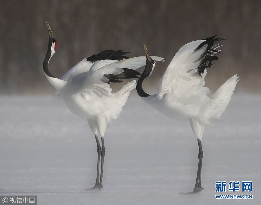 12月25日訊(具體拍攝時(shí)間不詳),日本北海道,一對(duì)丹頂鶴在冰面上翩翩起舞,動(dòng)作驚人一致。(圖片來源:視覺中國(guó))
