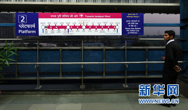 12月25日,在印度首都新德里洋紅色地鐵線,一名工作人員在站牌下職守。當日,連接新德里及其衛星城諾伊達(Noida)之間的洋紅色地鐵線建成通車。這條線路全長12.64公里。德里地鐵公司計劃未來提高這條地鐵線路自動化水平,以“無人值守模式”運行。目前,新德里運營地鐵線路共有7條,分別用顏色命名,包括紅色、黃色、藍色、綠色、橙色、紫羅蘭和洋紅色。新華網發 (張迺杰 攝)