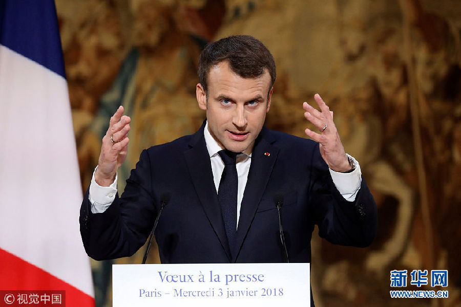 1月3日,法國巴黎,法國總統馬克龍在愛麗舍宮向記者團送上新年祝福。(圖片來源:視覺中國)