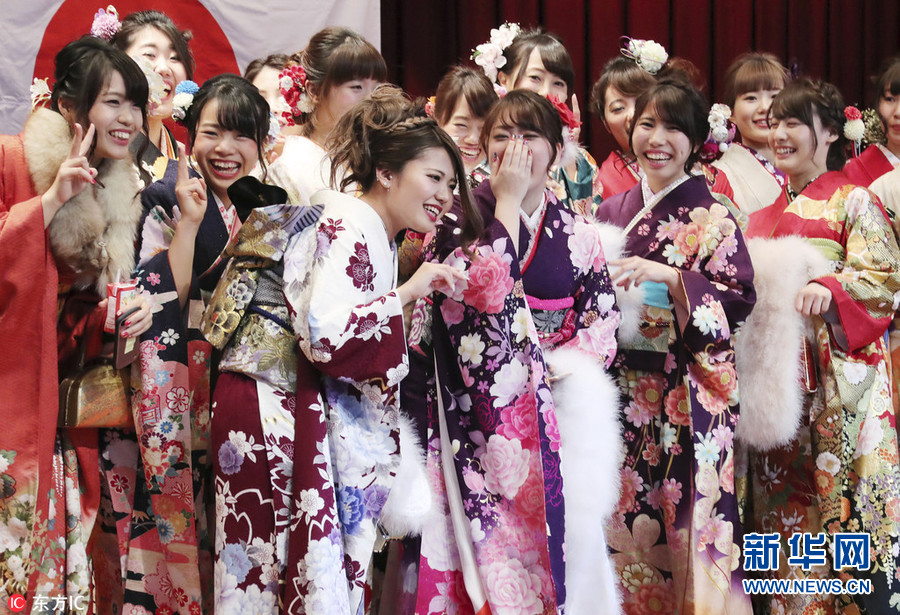 ? 1月7日,日本福岡縣北九州市,日本多地舉辦“成人節”慶祝儀式,少女們身穿和服盛裝出席。(圖片來源:東方IC)