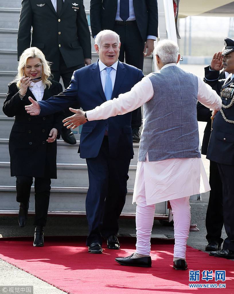 當地時間1月14日,印度新德里,以色列總理內塔尼亞胡抵達印度展開訪問。(圖片來源:視覺中國)