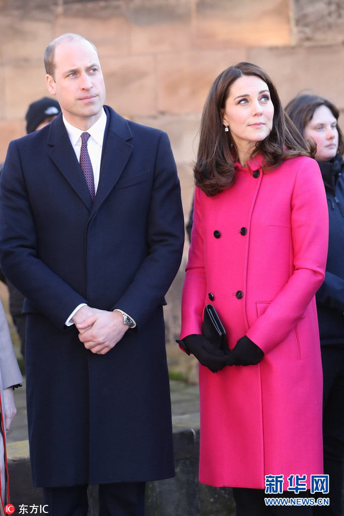 1月16日,英國西米德蘭茲郡考文垂,威廉王子夫婦造訪考文垂大教堂,凱特王妃一襲紅色大衣挺孕肚與人群熱情互動。(圖片來源:東方IC)