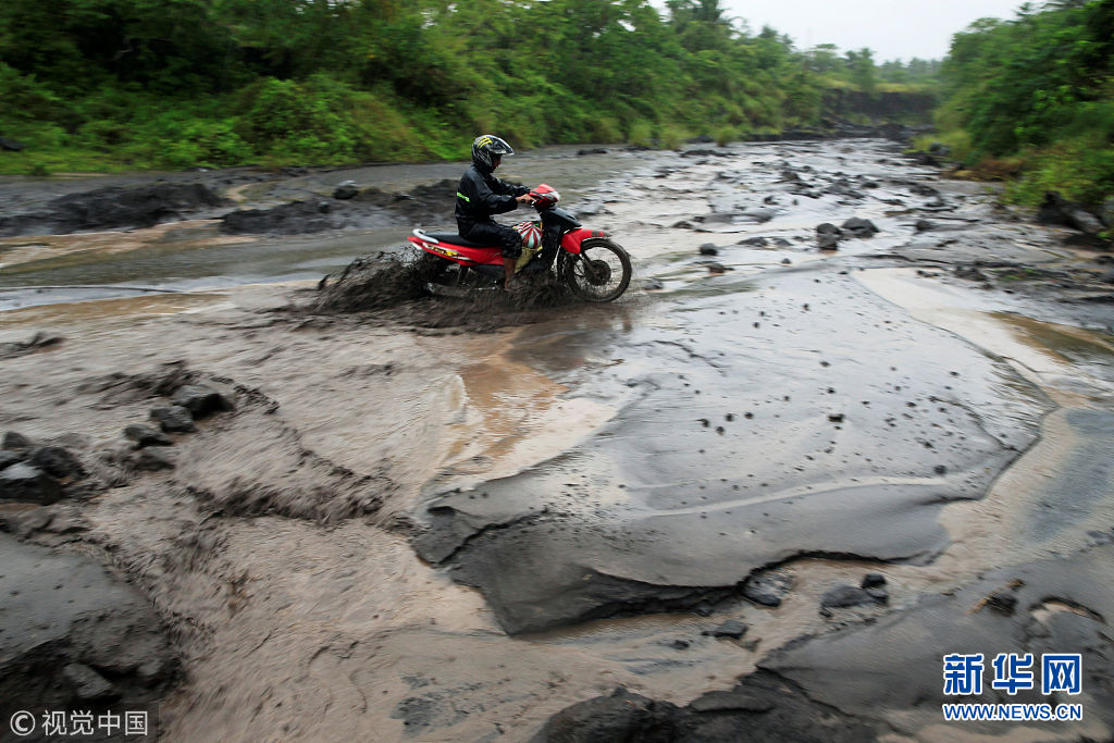 當(dāng)?shù)貢r(shí)間2018年1月27日,菲律賓阿爾拜省,民眾穿過混合著火山灰的泥漿河。(圖片來源:視覺中國(guó))