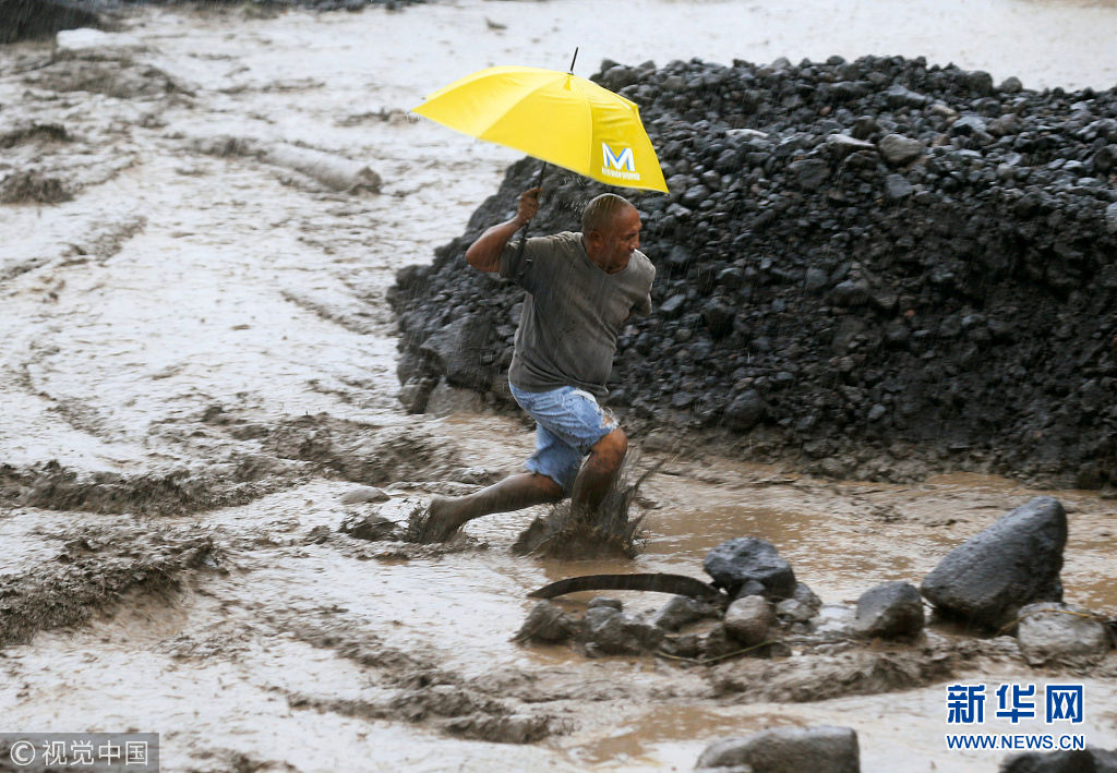當地時間2018年1月27日,菲律賓阿爾拜省,民眾穿過混合著火山灰的泥漿河。(圖片來源:視覺中國)