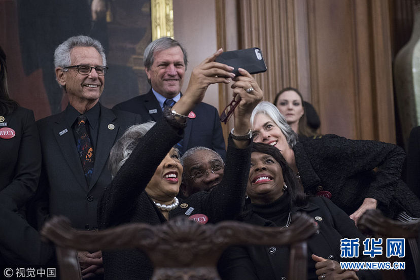 當地時間1月30日,美國華盛頓,民主黨國會議員和性侵幸存者一同穿黑衣現身國會大廈,聲援勇敢反對性騷擾和歧視的人們。眾議院民主黨人計劃穿黑衣出席特朗普的國情咨文演講,支持MeToo和TimesUp組織。 (圖片來源:視覺中國)