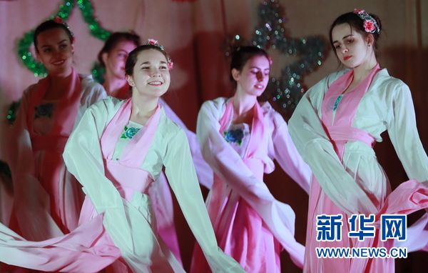 基輔國(guó)立語(yǔ)言大學(xué)孔子學(xué)院的學(xué)生表演中國(guó)舞蹈《采薇》。新華網(wǎng)發(fā)(陳俊鋒攝)
