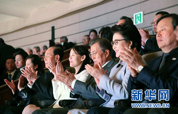 2月11日,在韓國首爾,韓國總統文在寅(右三)與朝鮮最高人民會議常任委員會委員長金永南(右五)和朝鮮勞動黨中央委員會第一副部長金與正(右四)共同觀看演出。新華社/紐西斯通訊社