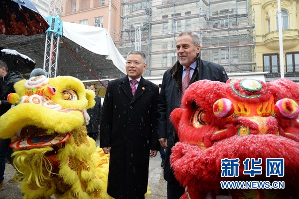 2月12日,中國駐克羅地亞大使胡兆明(左)與克首都薩格勒布市長米蘭·班迪奇在薩格勒布出席為慶祝中國春節舉辦的舞獅表演活動。新華網發(高磊攝)