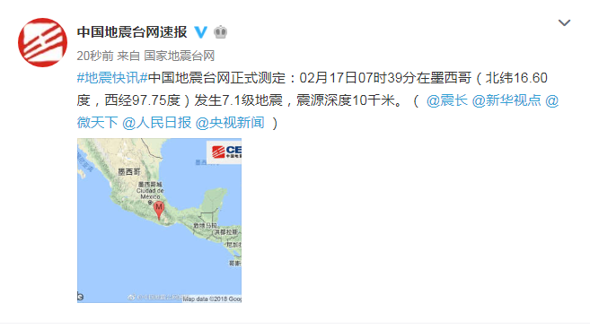 新華社快訊:中國地震臺網(wǎng)正式測定:2月17日7時39分,在墨西哥(北緯16.60度,西經(jīng)97.75度)發(fā)生7.1級地震,震源深度10公里。