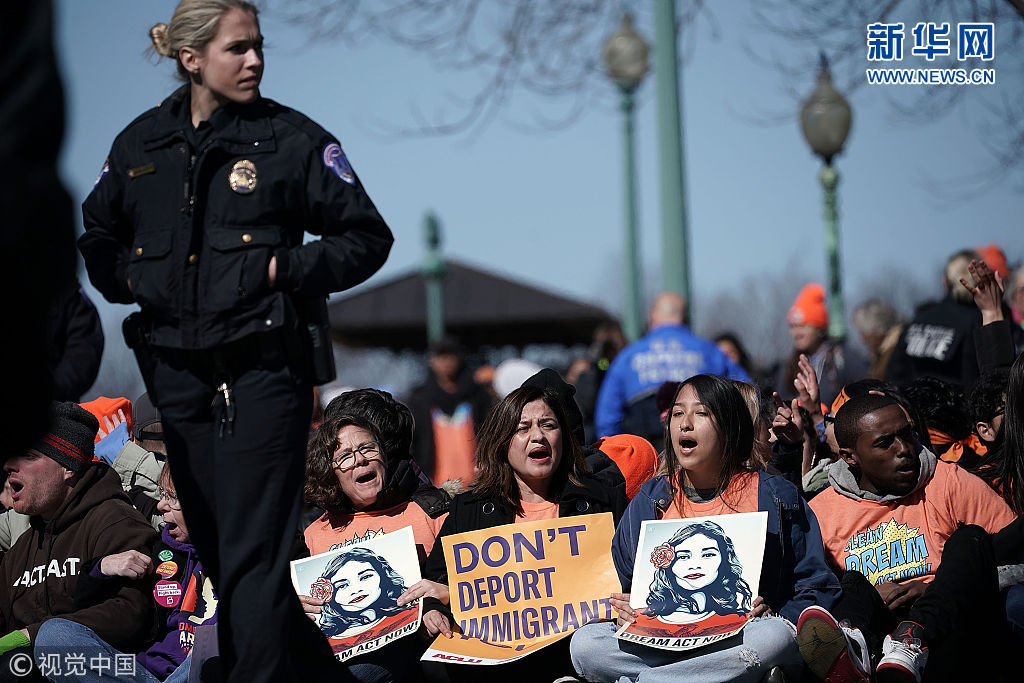當(dāng)?shù)貢r(shí)間2018年3月5日,美國華盛頓,移民活動(dòng)家在國會山舉行集會,抗議特朗普終結(jié)“夢想法案”計(jì)劃。(圖片來源:視覺中國)