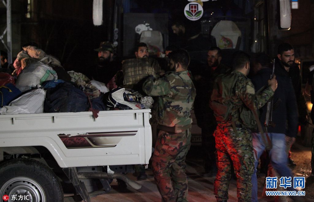 當(dāng)?shù)貢r(shí)間2018年3月9日,敘利亞,首批敘利亞反政府武裝人員從東古塔地區(qū)撤離。(圖片來源:東方IC)