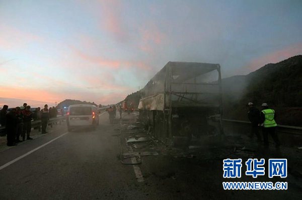 這是3月13日在土耳其喬魯姆省拍攝的被燒毀的大巴車。新華社發