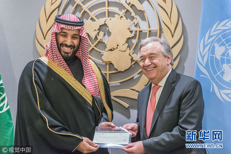 3月27日,美國紐約,沙特王儲穆罕默德·本·薩勒曼訪問聯(lián)合國總部,簽署向也門人道主義援助計劃自愿財政資助備忘錄。(圖片來源:視覺中國)