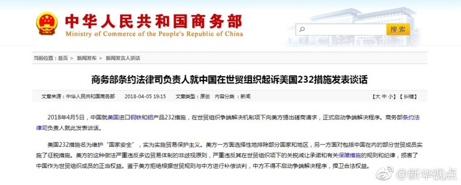 2018年4月5日,中國就美國進(jìn)口鋼鐵和鋁產(chǎn)品232措施,在世貿(mào)組織爭端解決機(jī)制項(xiàng)下向美方提出磋商請求,正式啟動(dòng)爭端解決程序。商務(wù)部條約法律司負(fù)責(zé)人就此發(fā)表談話。