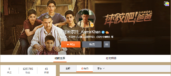 阿米爾·汗在中國社交媒體上的粉絲數過百萬,