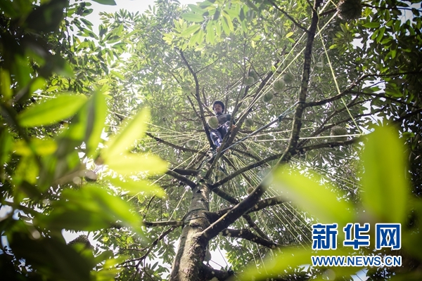 新華網(wǎng)曼谷4月24日電(陳家寶)23日清晨,在泰國曼谷以東約250公里的莊他武里府的果園里,綴滿榴蓮的高樹上,黝黑的果農(nóng)爬上枝椏,割下一個(gè)個(gè)約3公斤重的果實(shí)。
