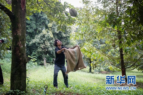 泰國莊他武里府果園中,一個(gè)工人在樹下以麻袋接住摘下的榴蓮。新華網(wǎng)發(fā) (阿里巴巴提供)